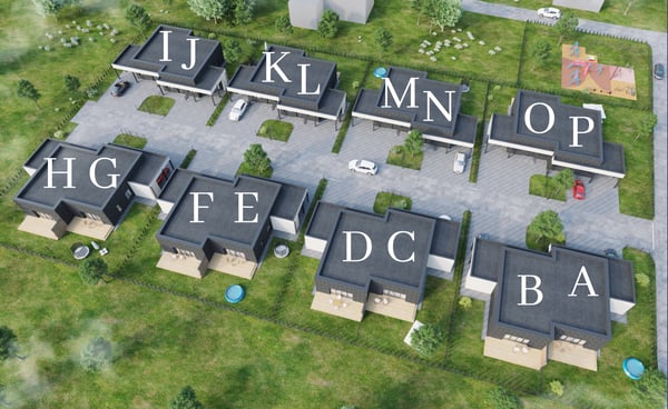 Žemiau pateikiama informacija apie kiekvieną Lieporių kotedžų kvartalo gyvenamąjį namą. Namai yra išdėstyti tokia tvarka, kaip pavaizduota schemoje.